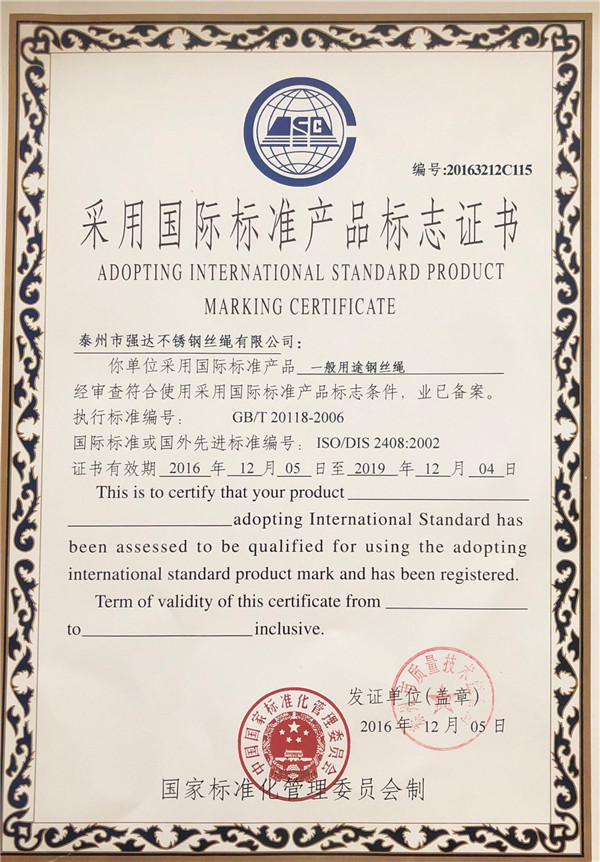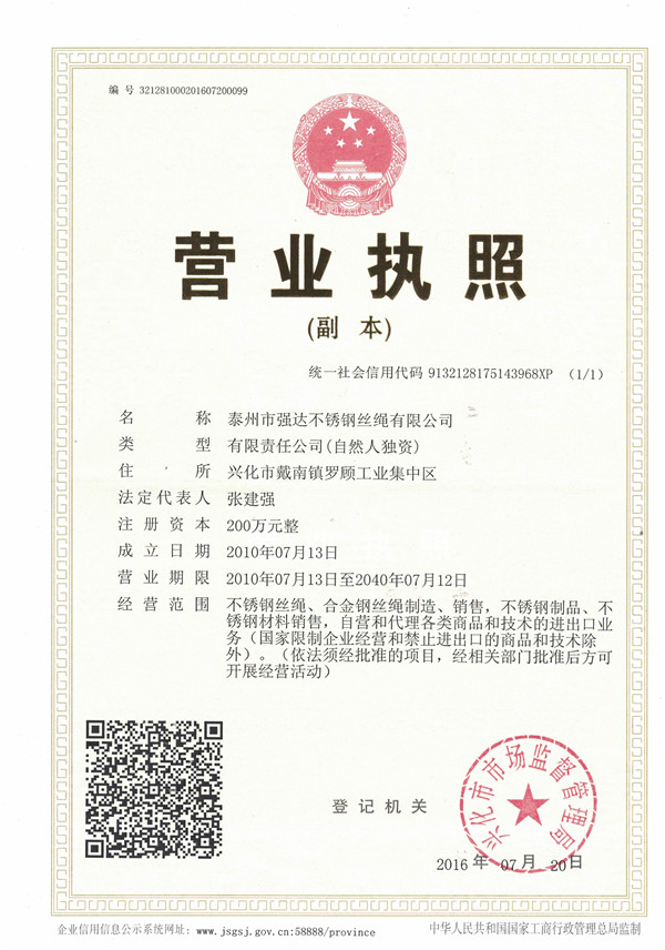 泰州市強(qiáng)達(dá)不銹鋼絲繩有限公司位于江蘇興化市戴南經(jīng)濟(jì)開發(fā)區(qū),公司致力于不銹鋼絲繩產(chǎn)品生產(chǎn),立志成為“國內(nèi)技術(shù)標(biāo)桿型吊索具生產(chǎn)企業(yè)”。以此戰(zhàn)略思想指導(dǎo),公司堅(jiān)決貫徹“質(zhì)量贏市場,管理增效益,誠信贏天下”的質(zhì)量方針。以完善的服務(wù)在國內(nèi)不銹鋼絲繩市場樹立良好的品牌形象。公司榮獲“江蘇省質(zhì)量信得過企業(yè)。     靈活的管理機(jī)制,經(jīng)驗(yàn)豐富的